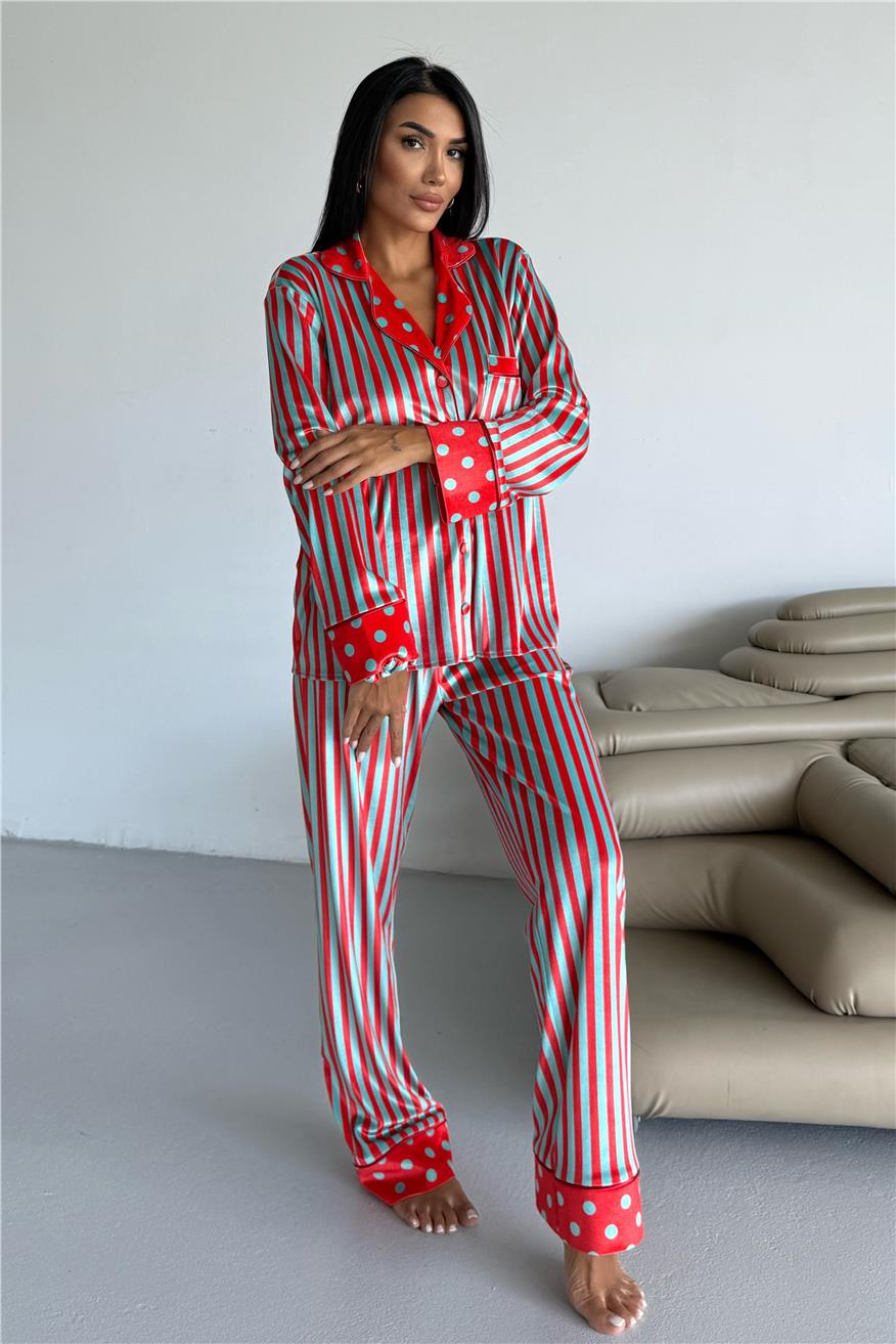 Mix Retrò Turuncu Mint Kadife Uzun Pijama Takımı (1529-22-S)