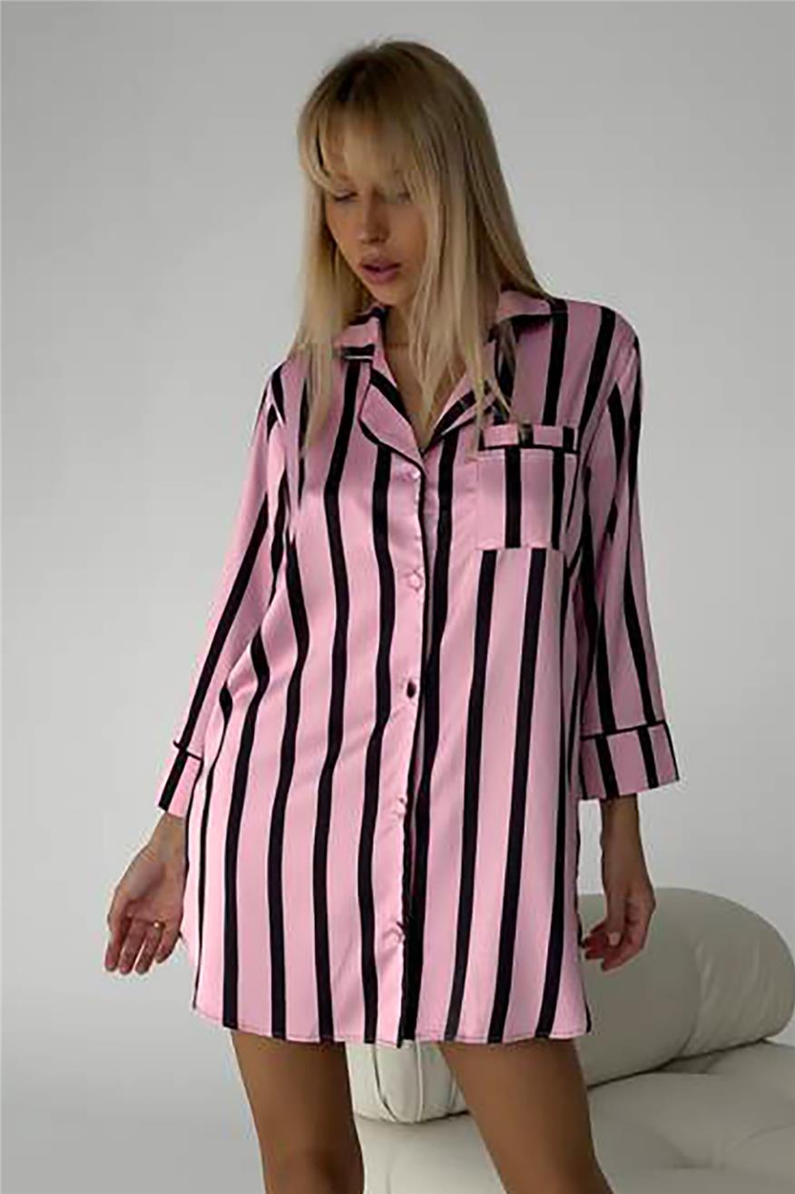 Strisce Rosa Larghe Saten Uzun Tunik Gecelik